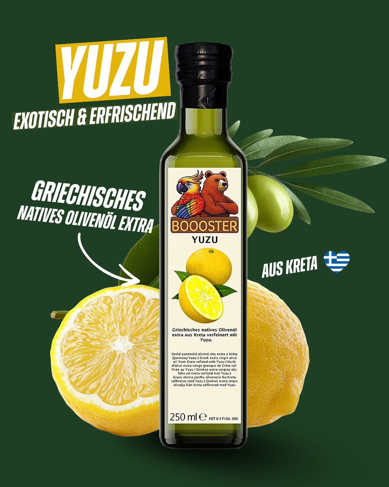 <p>Der Charakter der japanischen <strong>Yuzu</strong> ist unverwechselbar: ein Zusammenspiel aus fruchtiger Zitrone, süßlicher Orange und leicht bitterer Grapefruit. In Japan gilt sie als Symbol für Glück und Schutz. Im Zusammenspiel mit <strong>nativem Olivenöl extra</strong> entsteht ein frisches, komplexes Aromenspiel – ideal als feines Finish und als vielseitige Küchenzutat.</p>