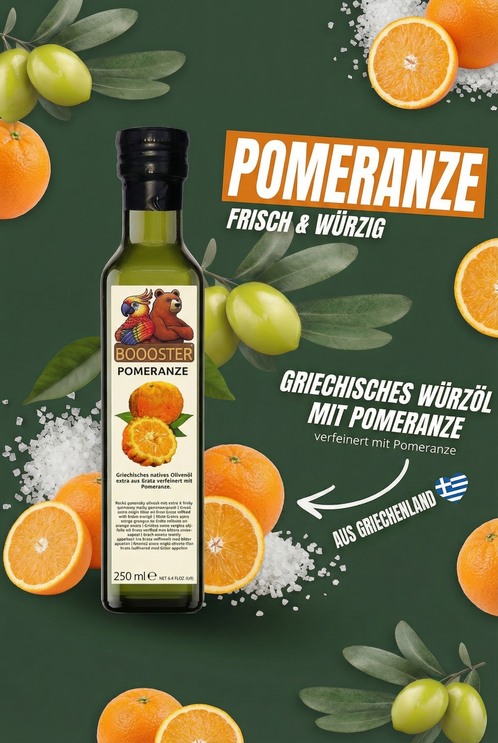 BOOOSTER Pomeranze Würz-Öl 250ml Natives Olivenöl Extra hergestellt auf Kreta