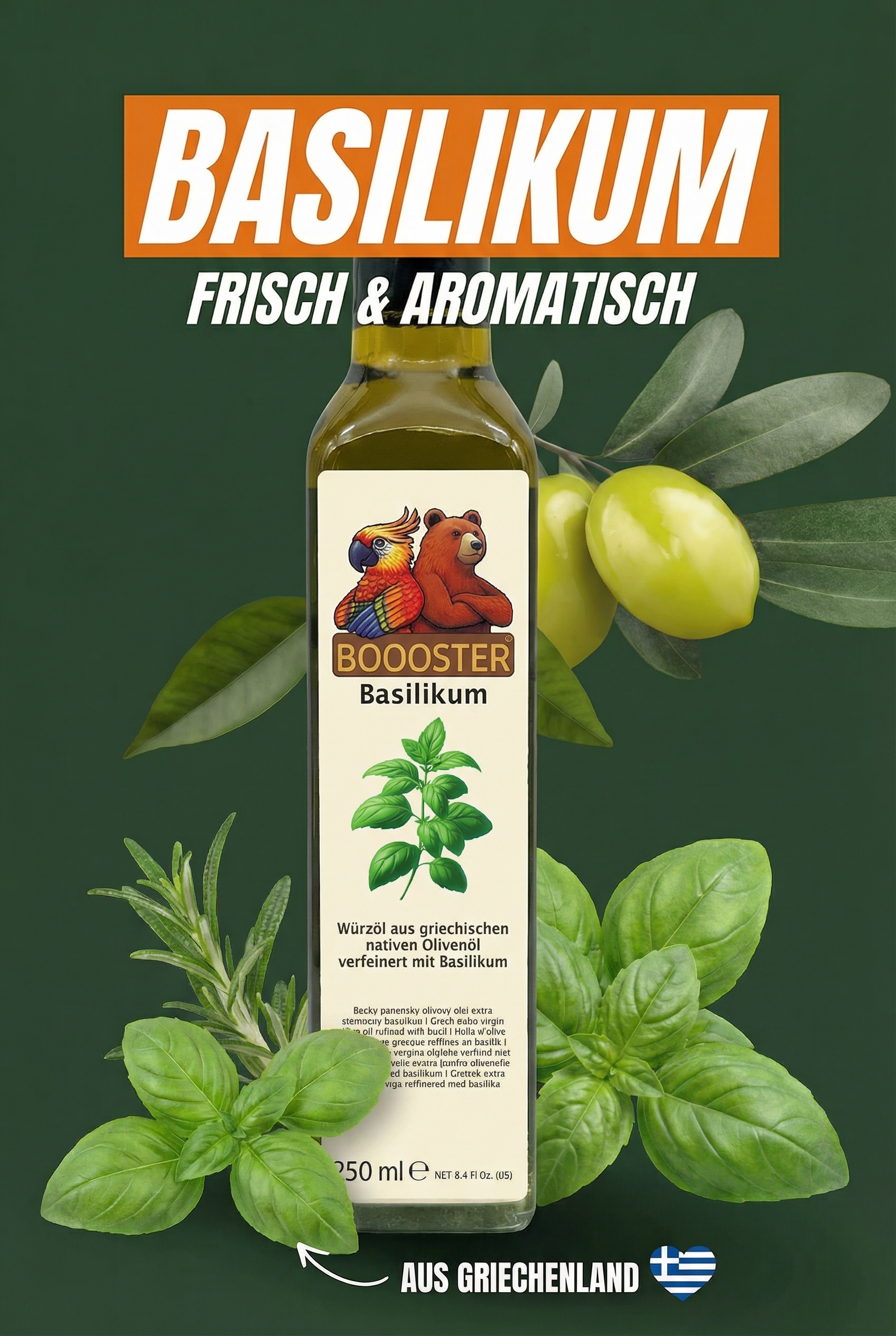 BOOOSTER Basilikum Würz-Öl 250ml Natives Olivenöl Extra aus Griechenland